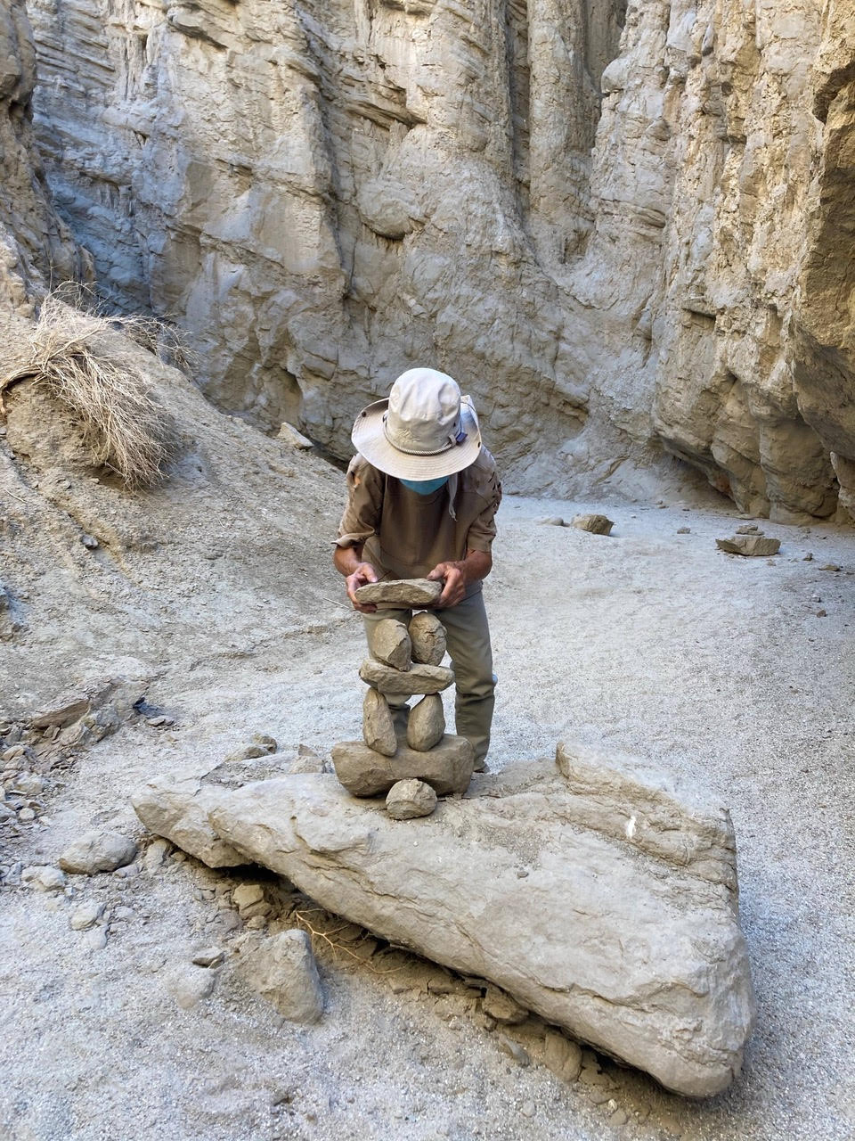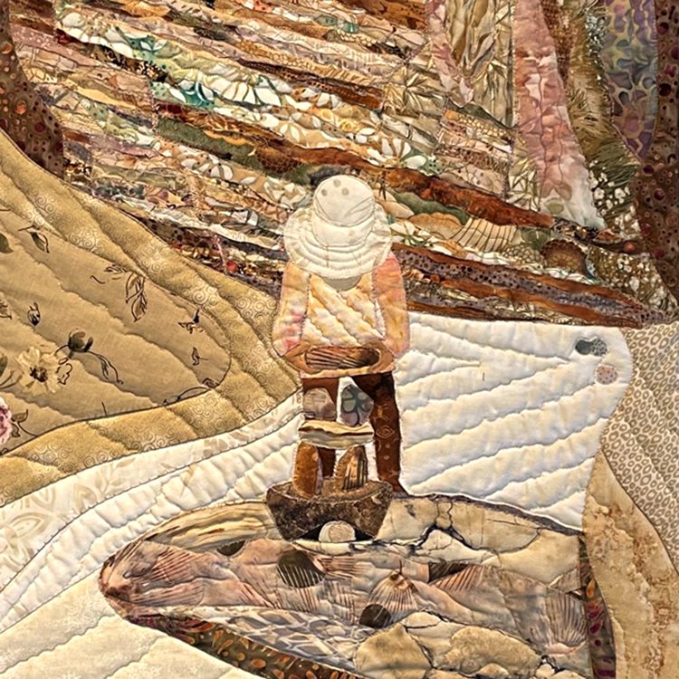 She and her husband and their friend Chan were hiking in the renowned Slot in Borrego this past winter, when Chan stopped to stack a rock sculpture. Martha’s husband Bob snapped a picture and Martha later translated the timeless desert moment—person plays with rock–into fabric.