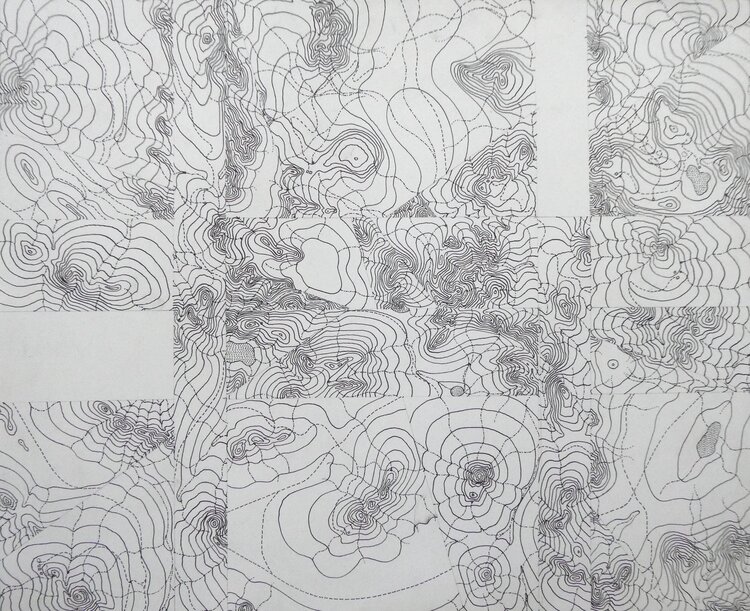 The show boldly invites landscape—often a taboo or antiquated theme in the contemporary art world—back onto the stage. Moore’s own maps are “a direct result of wandering, turning USGS topos this way and that, wondering what the hell could be down that vanishing two-track on the mesa, across the dry lake, over the next hill…”