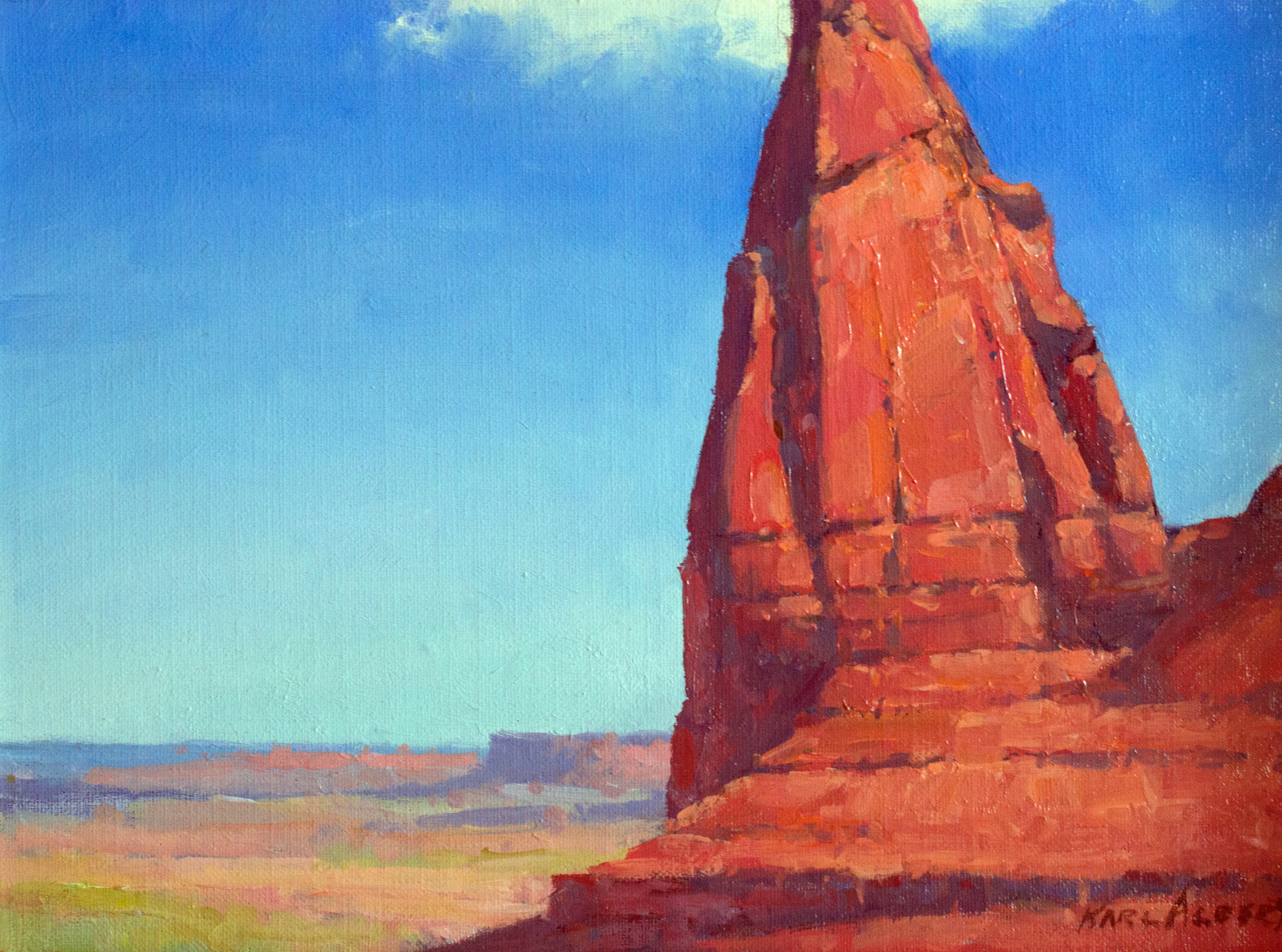 Prior to his death in 2007, Karl shared a trailer home with Darwin Duncan–his friend of 70 years–at the Silver Spur Mobile Manor in Palm Desert. The two aging artists painted plein air in the nearby desert that was later obliterated by Big Horn Golf Club. Diane will be sharing more about this overlooked Coachella Valley painter. In the meantime, she’s selling a piece he did on a trip they took together to Monument Valley. Karl Albert called it Ad Astra Aspera, a Latin phrase meaning To the Stars by Hard Ways.