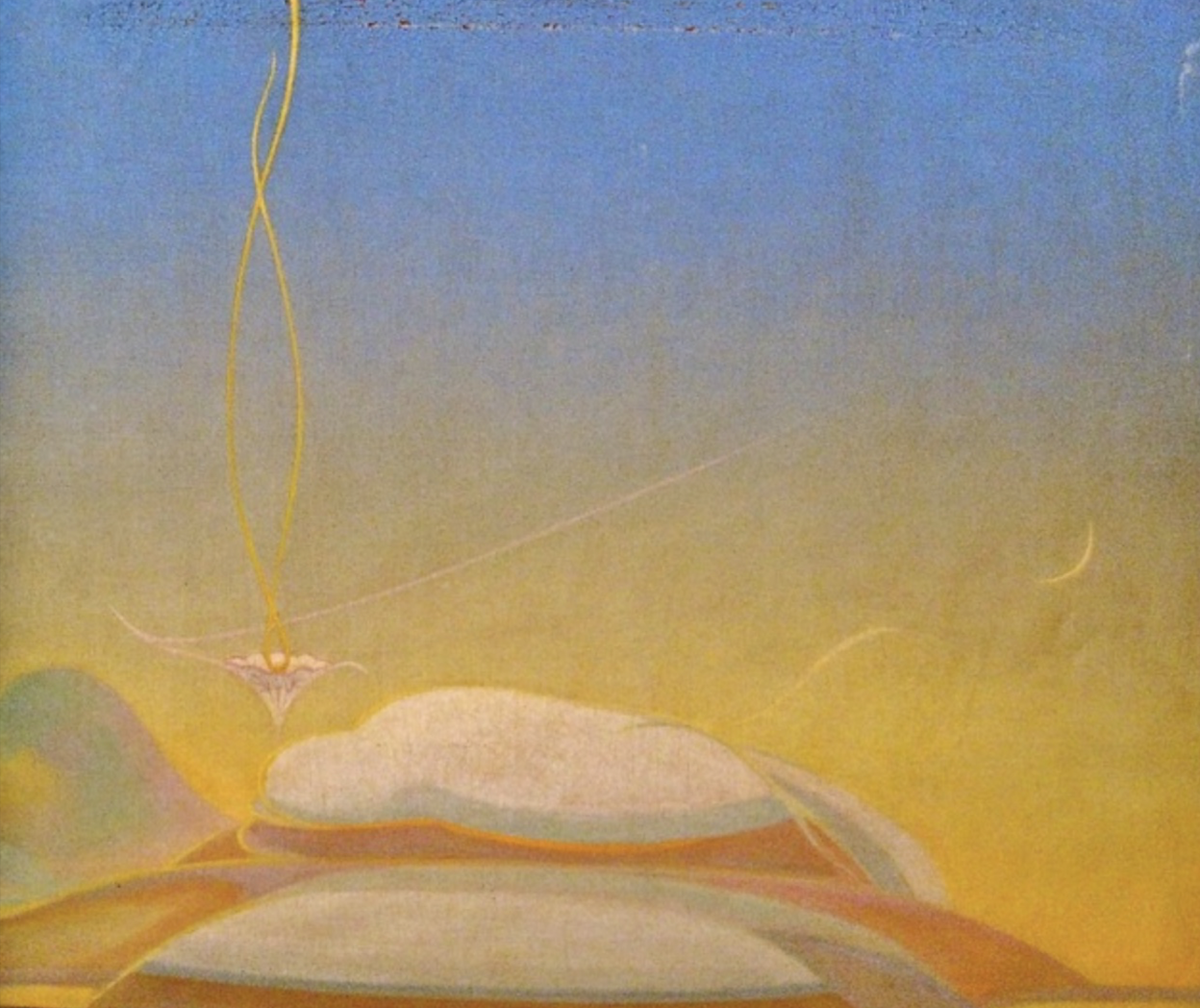 Three years ago, with his health failing, Acord moved to an assisted living center in Tucson. While visiting him there, Glenda first noticed the painting on the wall of his room. At the bottom of the frame were pillows or clouds or mountains; from there twin rays or tendrils twined together and sprouted heavenward. The background colors were otherworldly yellows and blues.