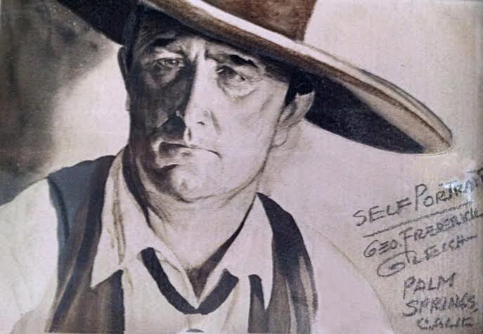In the 1930 Federal Census George Frederick Gleich is living in San Gorgonio Pass, Palm Springs, California. His half-sister Marie, now divorced from her second husband, lived in Palm Springs village then and for many years afterward, so his assertion that he came to Palm Springs because his sister lived there is true. At this point George was still painting as Gleich–a 1932 oil painting of a Pala Indian man that was sold at auction a few years ago is signed George Frederick Gleich, as is a Palm Springs self-portrait.