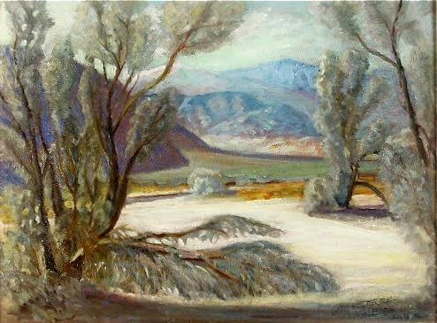 George’s correspondence with Eve Ball confirmed that he and his wife spent pleasant winters on their Mesa property and the hot Arizona summers in a variety of cooler places. He did portraits and taught painting classes at the Grand Lodge on the north rim of the Grand Canyon from the mid-1940s until 1953 when, as he wrote his friend Art Green, it’s “too high for Alan—ha, ha! And too low for me (in income) as the meals and staying there are too high.” During the 1950s the Fredericks summered in Colorado, Southern California, Wyoming, in a friend’s mobile home in Oracle, AZ, and in Paradise Valley, AZ, in wealthy patron Walter W. Ross’s winter home, equipped, as Alan delightedly wrote a friend, with “electric refrigeration.”