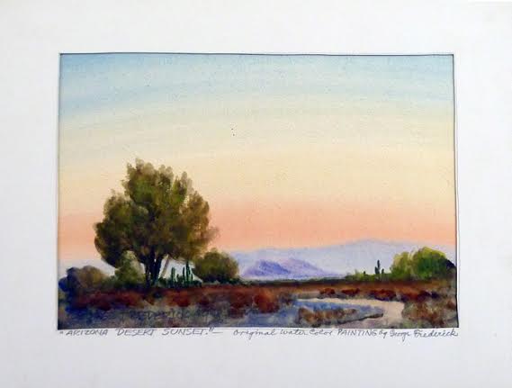 There were references to artists who’d studied with Frederick: El Paso’s G. Harris Shelton in the 1930s and Bill Sutherlin in 1961 who said he “went on a landscape painting tour of the Southwest with George (Smokey) Frederick, a well-known Arizona landscape painter.” In the late 1940s and early 1950s George had a very young student named Frank Mannarino who was driven by his parents and older sister from Tucson to the Fredericks’ home in east Mesa every Saturday for painting lessons. Frank’s sister said, “I remember where the Fredericks lived, close to the Superstition Mountains. The studio was like one big room with benches or cots against the walls, and there were serapes lining the walls. The kitchen was separate from the house and had a big dry sink. They brought water in. There was an outdoor toilet, and they had no electricity. They were very isolated on their property and had no neighbors.”