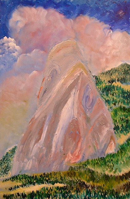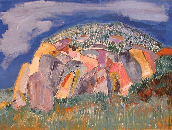 I was walking through the library at Idyllwild Arts Academy one day when my attention was grabbed by hunks of color in the shape of a familiar local landmark: Suicide Rock. The colors were almost cartoonish, but the painting drew me in perfectly.