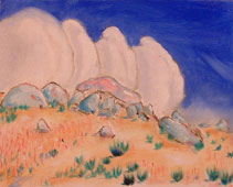 When he painted the version that caught my attention, he had just returned from a trip to Santa Fe –“the colors of that region still hot in my mind,” he wrote. “Most of it was executed with a palette knife and I was thinking about Cezanne the entire time.” This explains my pleasant shock when I saw the rock. It was Cezanne and Santa Fe and Steve Hudson all jumbled together to make a familiar place new and right.