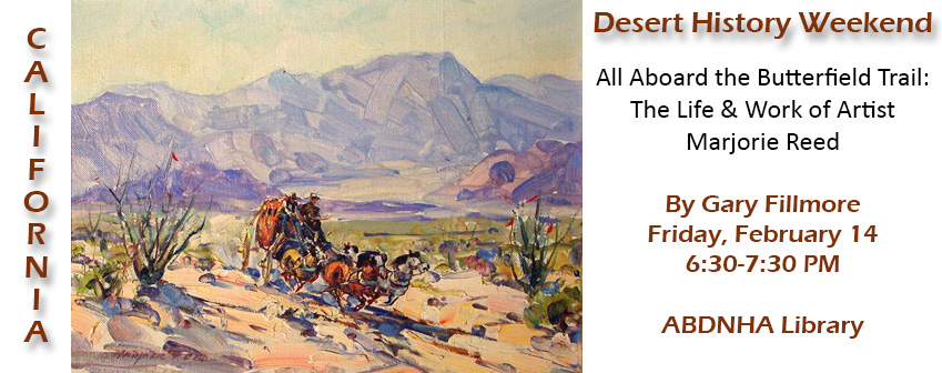 Hear Gary Fillmore discuss the life and work of Marjorie Reed on February 14th, 2020, 6:30-7:30 pm, as part of California Desert History Weekend sponsored by the Anza-Borrego Desert Natural History Association. To register for the event: https://www.abdnha.org/deserthistory/