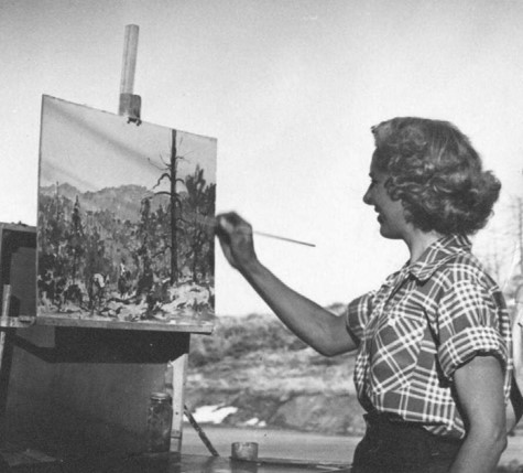 Marjorie Reed painting near Black Mesa, Arizona, 1946, with her daughter Judy Morris in foreground. Photo by Harry Lindgren. Courtesy of Marjorie Reed Estate.