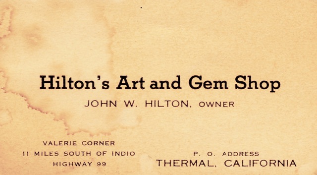 Born in North Dakota, Hilton first came to Valerie Jean corner in Thermal in 1931. Valerie Jean’s was the famous date shop where old Route 86 meets Ave. 66. Hilton opened his gem and art shop across the street. The ruins of the gemshop were leveled a few years ago; the date shop building still stands.