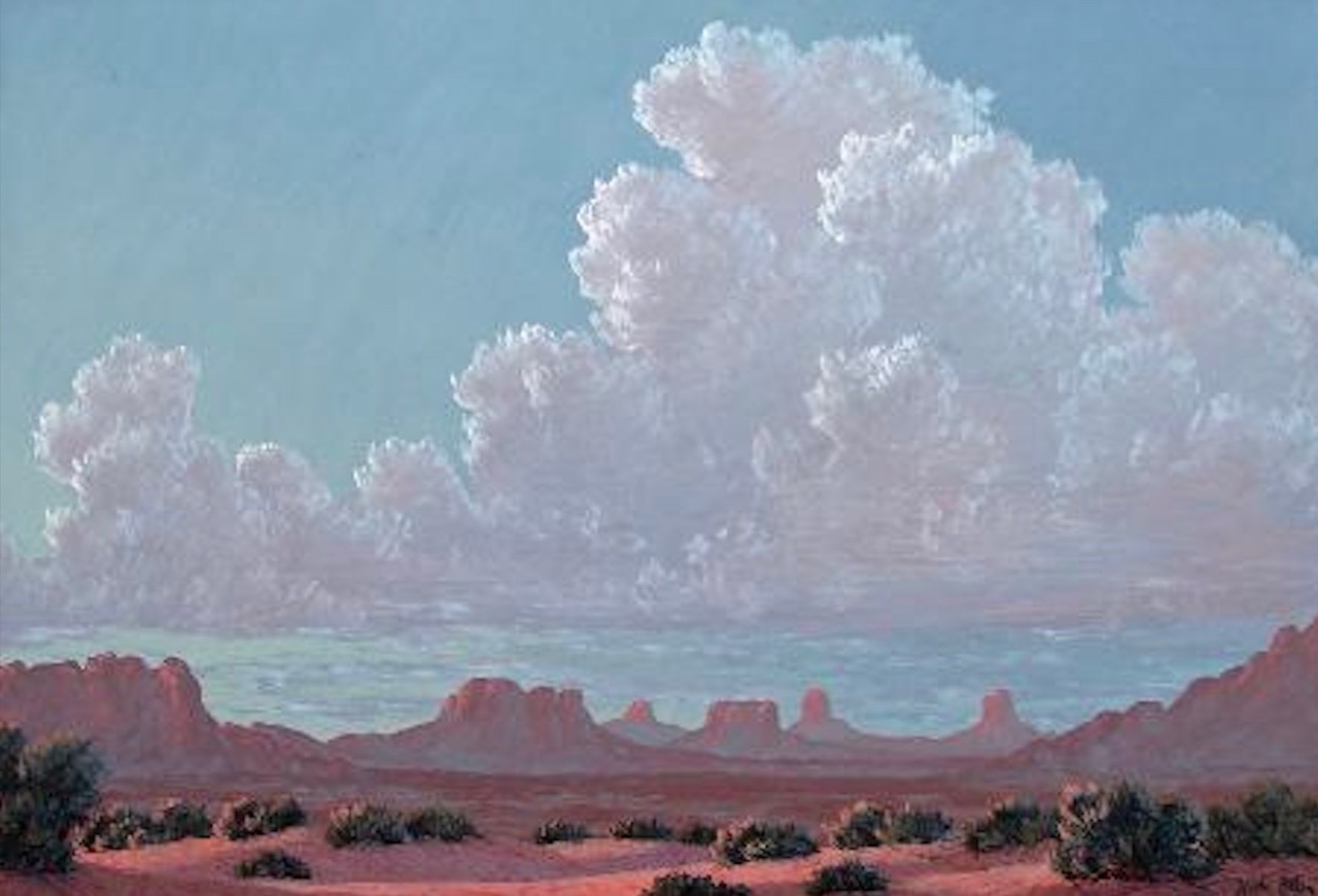The three of us sat in silence. I made a U-turn on the old airstrip and drove back to town, awed by this glimpse into the mythic life of the first family of desert painters. Kathi—who now lives in Roosevelt, Utah–deserves to be written about without mention of her dad on occasion. She has an art career all her own. At Dan’s Bodega Bay gallery, co-owned by his wife Linda Sorensen, customers often prefer Kathi’s pastoral paintings over the work of John Hilton. Still, you can hardly talk about one without the other.