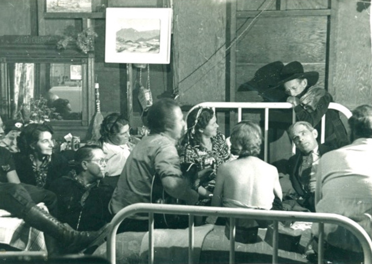 John Hilton with guitar, Eunice Hilton (with dark-hair) seated on bed at the Thermal art and gem shop.