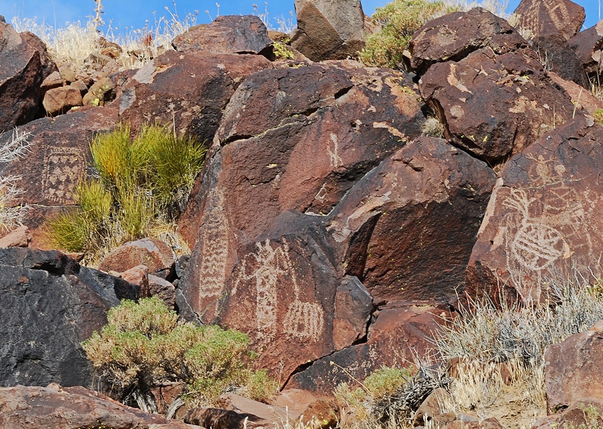 The Pleistocene extinctions are still something of a mystery. Most likely, these animals died off because of over-hunting by humans combined with a warming climate. For the next ten thousand years, human populations in the Mojave Desert would withdraw and expand during dry and wet periods. Their petroglyphs became more complex, from crude bighorn sheep to more realistically drawn bighorn sheep, from the single line of a throwing stick to bows and arrows accompanied by hunters. Possibly most of these petroglyphs were made 1,000 to 3,000 years ago by the ancestors of contemporary tribes like the Shoshone and Paiute. Or possibly not, because rock art is hard to date.