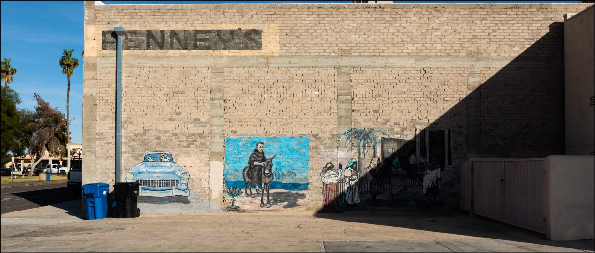 The desert sun cuts sharp shadows, reveals the geometry of the architecture. The murals on the brick surfaces remind me of Egyptian pyramids, the old sign of the long-closed store reveals the time gone by, it all adds up.