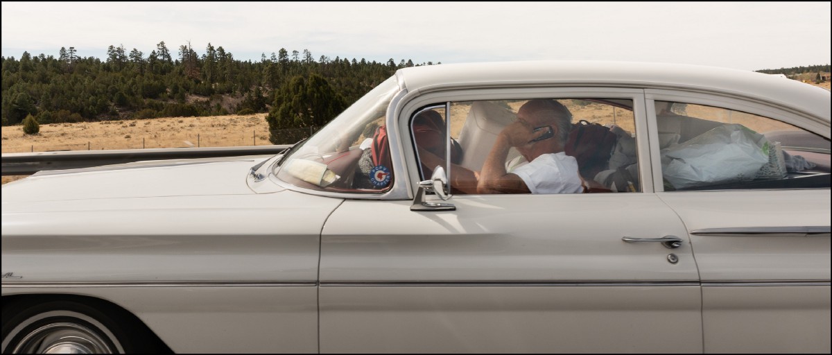 The car is filled with random stuff, suitcases, plastic bags, a styrofoam cooler, scraps of paper. The accumulation rises well above the window line. The driver is reduced, he sits alone in his tiny cockpit absorbed in his conversation and the road ahead. I wonder if he’s headed towards home or away, happy to be returning to a life he loves or desolate and empty as he drives someplace new to start again.
