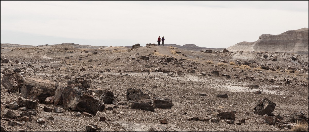 Here are two travelers walking on the surface of the moon. They have appeared out of nowhere, the only things moving in this vast, still place. The air carries the scent of rocks and dust, and we are reduced to our real size, our tiny selves in the middle of this gigantic landscape and the instant of endless time we are living in.
