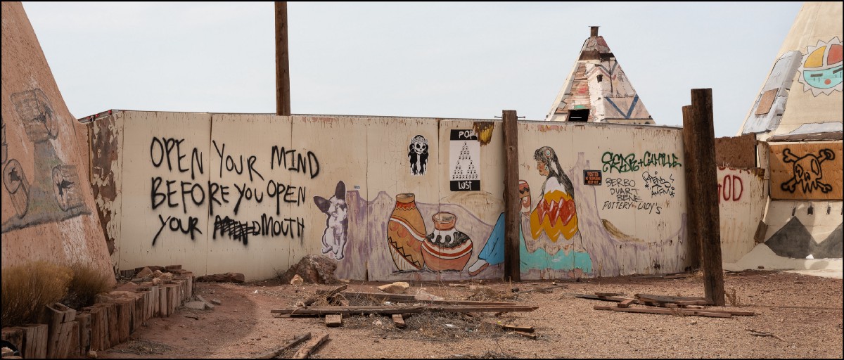 The Meteor City trading post sits just off of the highway, abandoned and alone. It takes an act of will to pull off the road here, get out of the car, and wander around. At first, it feels like maybe you’re in a movie where unexpected and unpleasant things are going to happen. Then, after a while, when no one comes around the corner with a gun and a crazy smile its forlorn and empty nature takes over, and it’s okay just to be here. I take pictures and wonder who wrote the words on the walls, and I imagine there are local kids who gather here sometimes on Friday nights to drink beer and hang out.