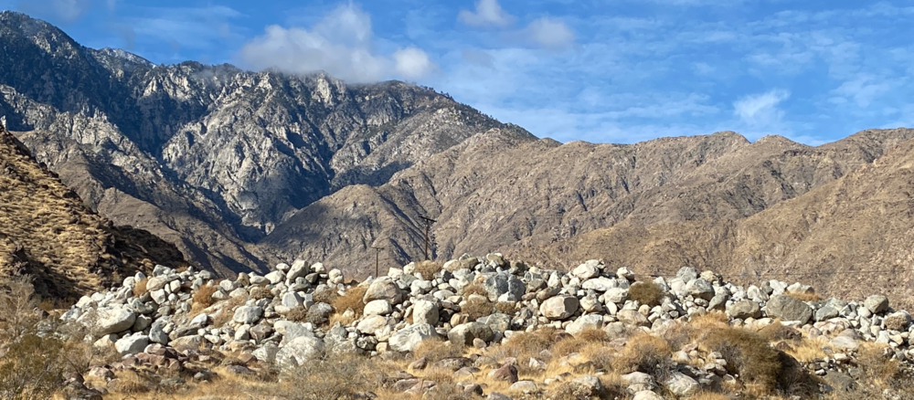 We were walking along an artificial path with boulders as big as baby elephants stacked along the trail. Looking below, Keeler said you get a sense of how natural movement—water and time—shaped the canyon before the bulldozers had their way. In 1860 massive floods roared through here, displacing Cahuilla families. The sounds of boulders tumbling eternally haunt this place.