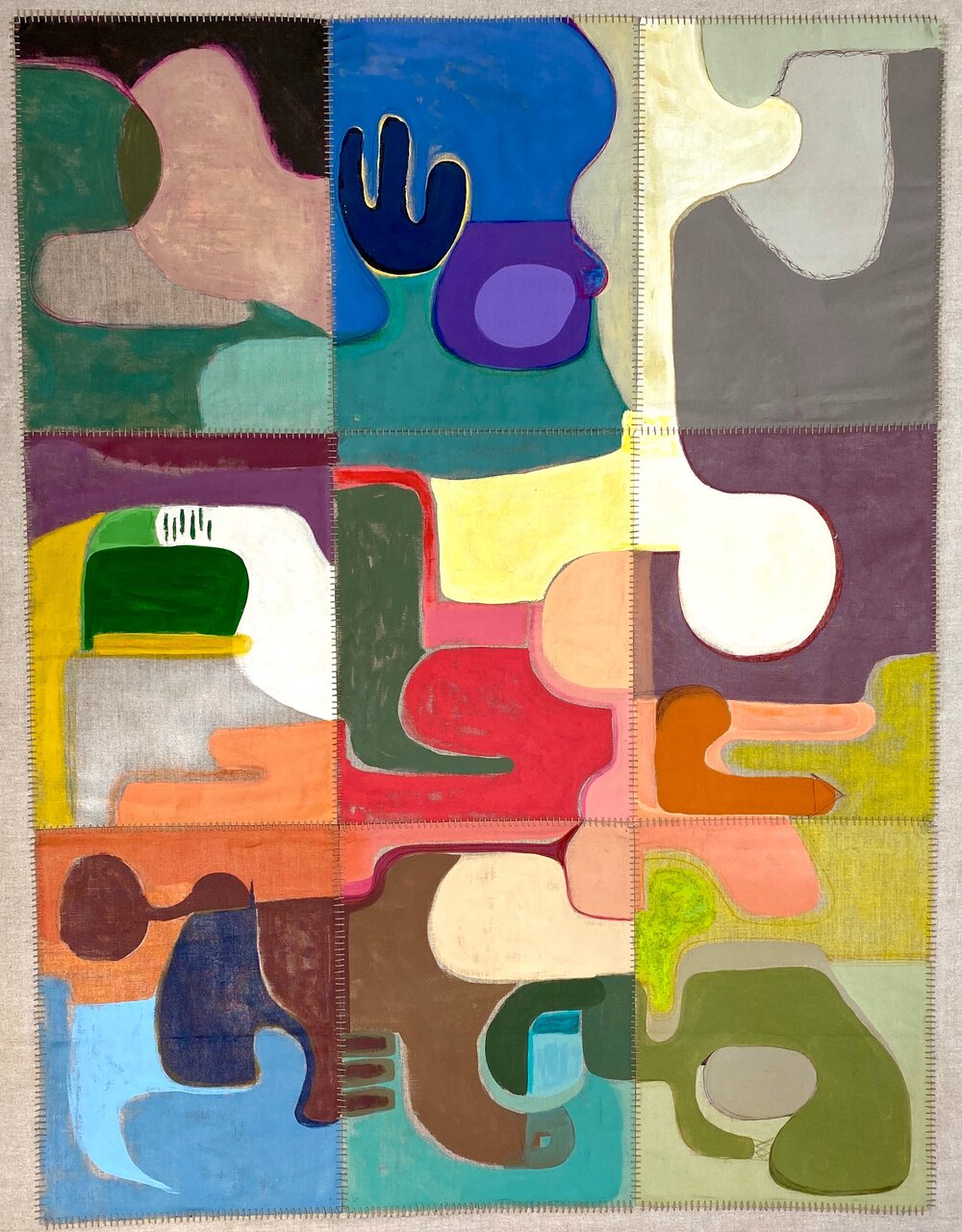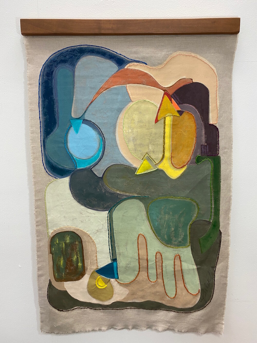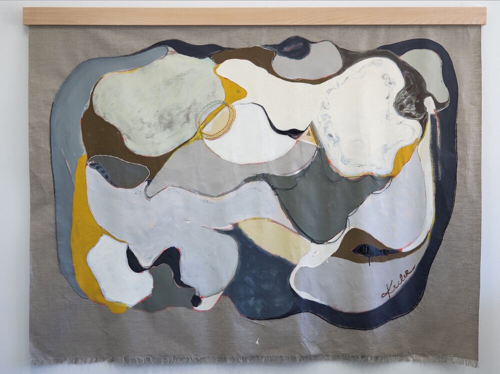 Keeler is attuned to tumbling, shifting and all forms of movement. Her maps are made on unstretched linen so that they move, like the flags her partner collects. She mixes perspective—birdseye and straight on—in the same map. The maps take shape with layers of paint, ink, enamel, sand, nail polish and thread. Arrows show the way; secret messages are inscribed and then covered over.