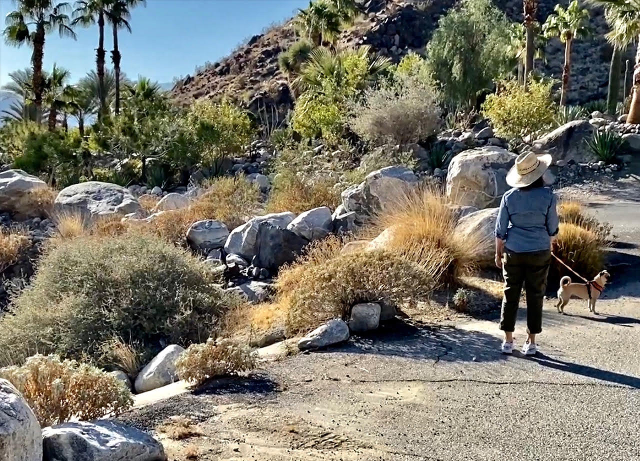 I drove up the base of the Chino Canyon alluvial fan to the neighborhood of Little Tuscany one recent morning after a rain. New snow laced Mt. San Jacinto. Standing on Keeler’s driveway, the cartographer and I could see the entire Valley spread out before us–all the way to Point Happy. Tourists promenaded by, marveling at the modernist architecture around us. Starting downhill on our walk, Keeler greeted Busby the dog, the first in a parade of pets and neighbors she knows by name. First rule of mapping: Know your neighbors.