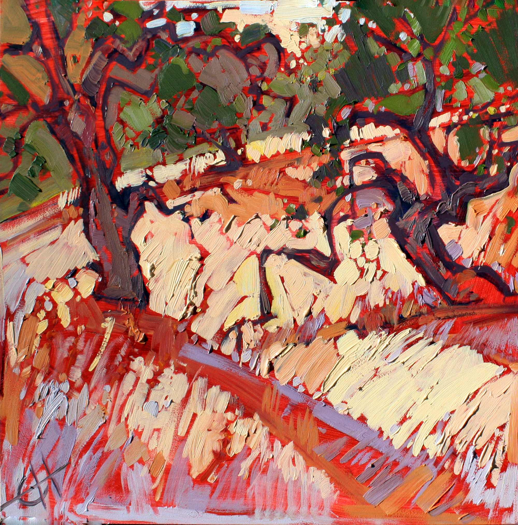 I always carry a camera with me, and my eye is constantly roaming for a unique perspective, an interesting tree, or a beautiful piece of light. Even driving in Los Angeles, I find myself getting excited about a sunset sky or a grove of eucalyptus trees. I have transformed Pasadena’s ficus trees into several beautiful paintings.