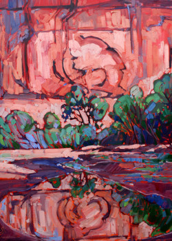 That’s pretty much what happened to Erin Hanson when she was climbing in the red rocks near Las Vegas. Yes she had laid the groundwork by studying art at Otis College of Art and later at UC Berkeley (with a detour into bioengineering). But then all at once—as she was hanging onto a rock slab fifty feet above the desert floor–she knew she had to paint rock, and she knew exactly how to paint it.