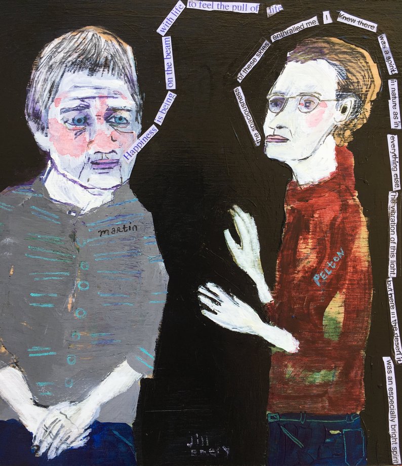Both women sought vastness in the desert (Pelton in Cathedral City, Martin in New Mexico) and both peered beneath the sandy surface to arrive at their abstract work. They finally meet in Jill Emery’s folk art piece: The 2 Agnes alone together in the desert with their thoughts.