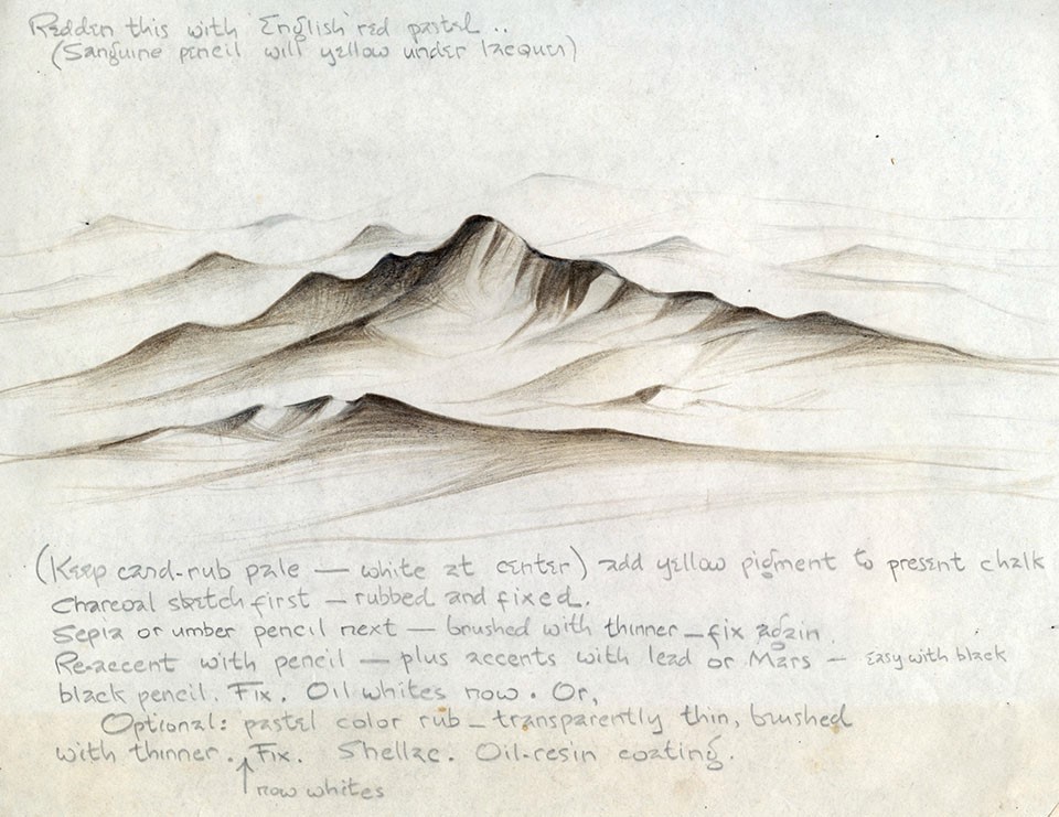 Robert Cole Caples, Sketch of Mountains with Process Notes. Courtesy of Nevada Museum of Art, Center for Art + Environment, Bequest of Rosemary Riley Caples.