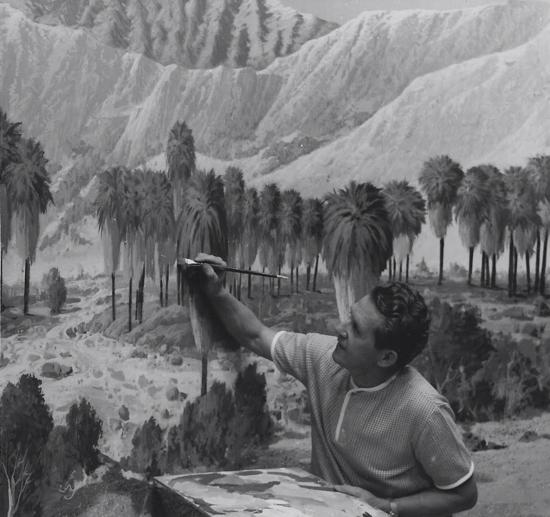 Val Samuelson painting a diorama at the Palm Springs Desert Museum, circa 1965. Courtesy of the Palm Springs Art Museum.