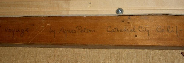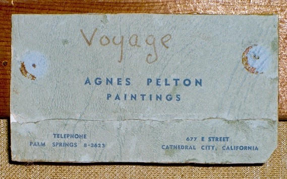 Penny snapped some polaroids and documented “Voyage” as an authentic Pelton. She said she was unable to find any reference to the painting in Pelton’s notes and “Voyage” is undated. On the back of the painting, the title was written in lovely script. Agnes Pelton’s card was attached, listing her address and phone number in Cathedral City. Sadly, Penny passed away a few years later; I don’t know what became of her archives.