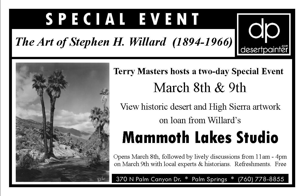 On Sunday March 9th, 11am to 4pm, the Jokis have invited Willard experts and Palm Springs historians to help honor the art and life of Stephen H. Willard. Drop by and celebrate the desert-Sierra connection.